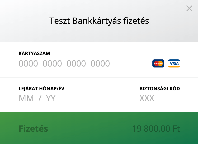 Az oldal bankkártyás fizetése jelenleg TESZT módban van. Bármilyen rendelést le lehet adni a következő adatokkal: